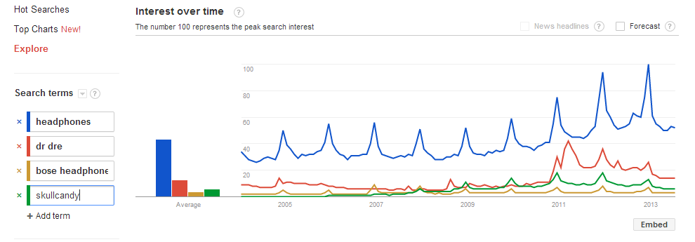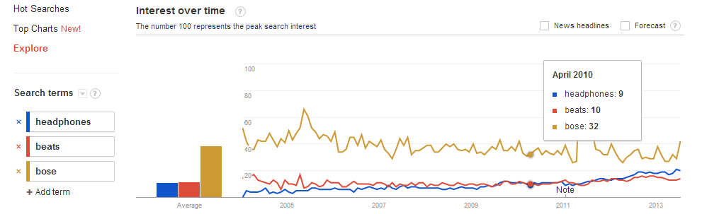 The easiest way of approaching this is by example, so I will settle quite randomly on the electronics category – headphones, maybe. I go to Google Trends, and type in 'headphones', and I can see between 2005 and 2013 that searches for headphones have been rising.