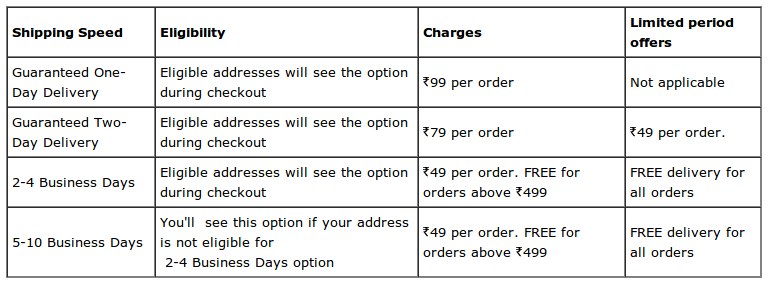 Its One Day Delivery service is a premium service and the company will be charging customers Rs.99 on a guaranteed one day delivery. Two day delivery will cost lesser. You can view the rates below.