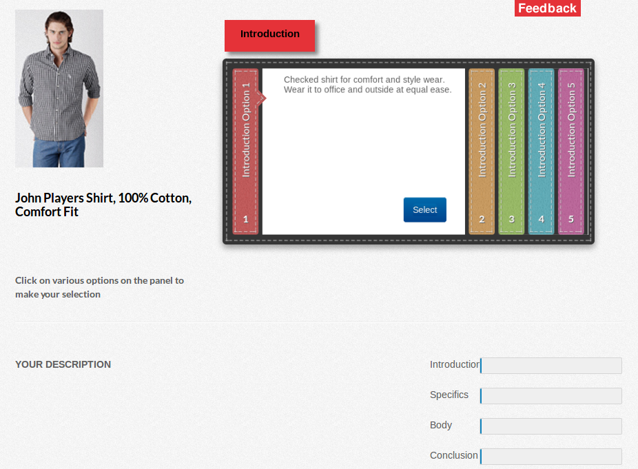 The game give a choice to choose 4 types of descriptions from a bunch of possible descriptions. You have to look at the product and select which description is the best for each type such as Introduction, Specifics, Body and Conclusion.
