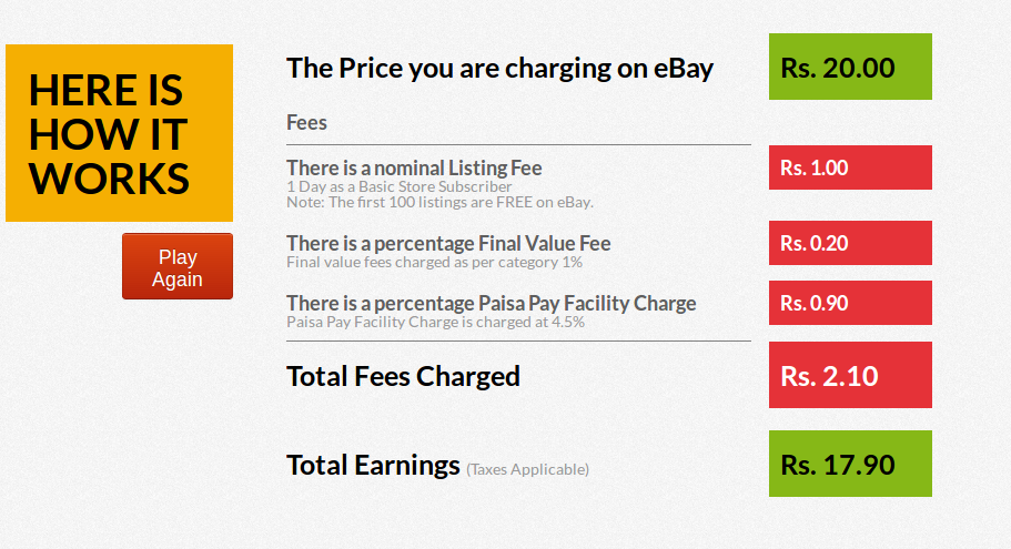 The game lets you input the price of your product and select the categories and the duration for which the product will be listed on the site. Once you enter the amount and check the various categories, you get a breakdown of the charges you will have pay for listing the product on eBay India.